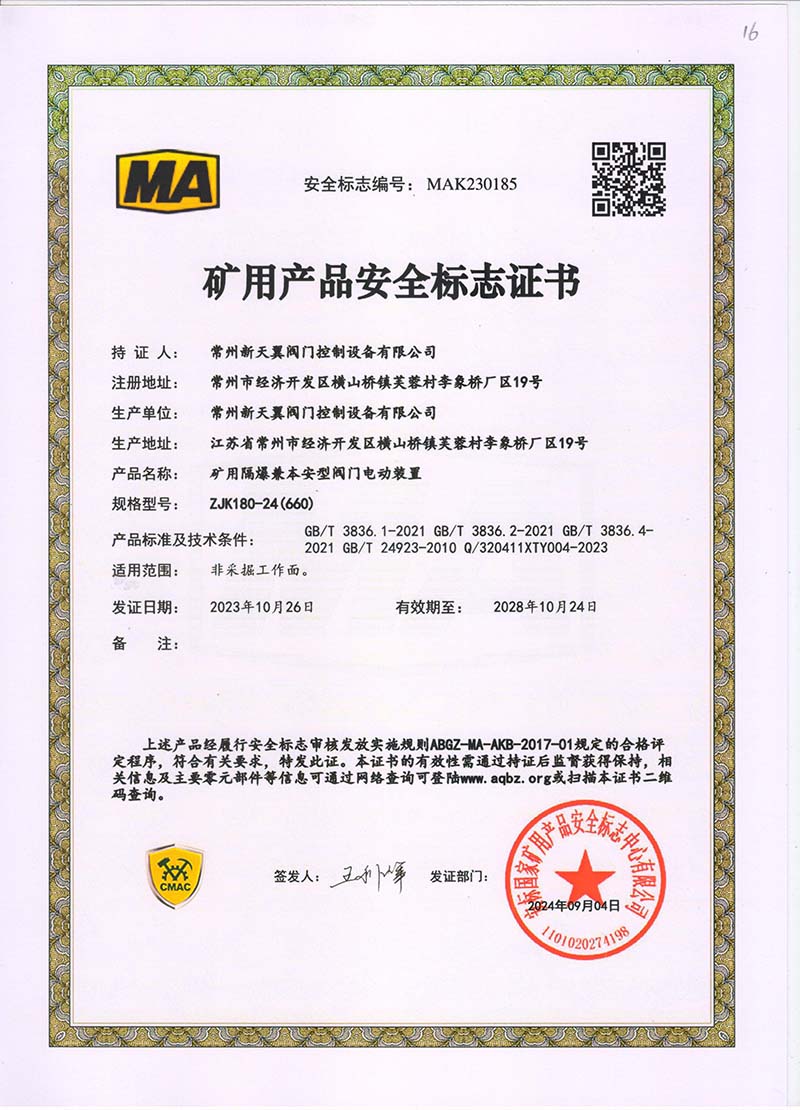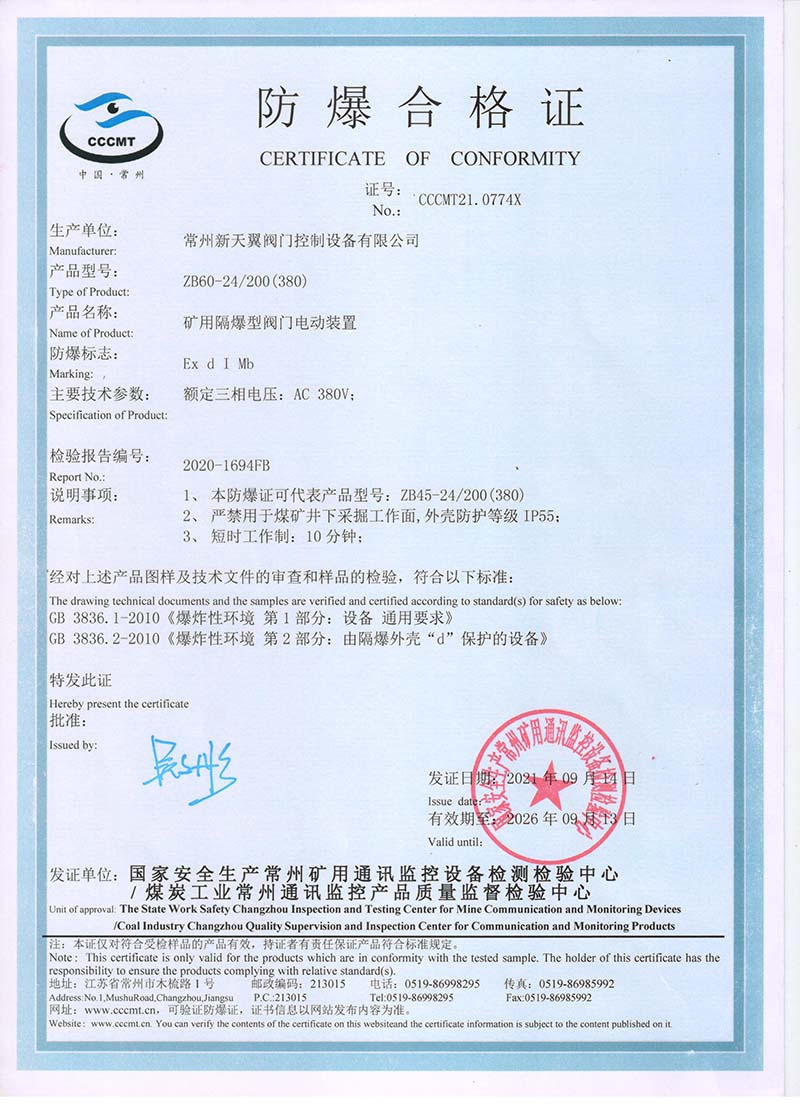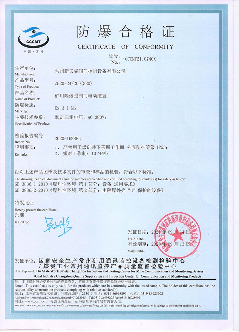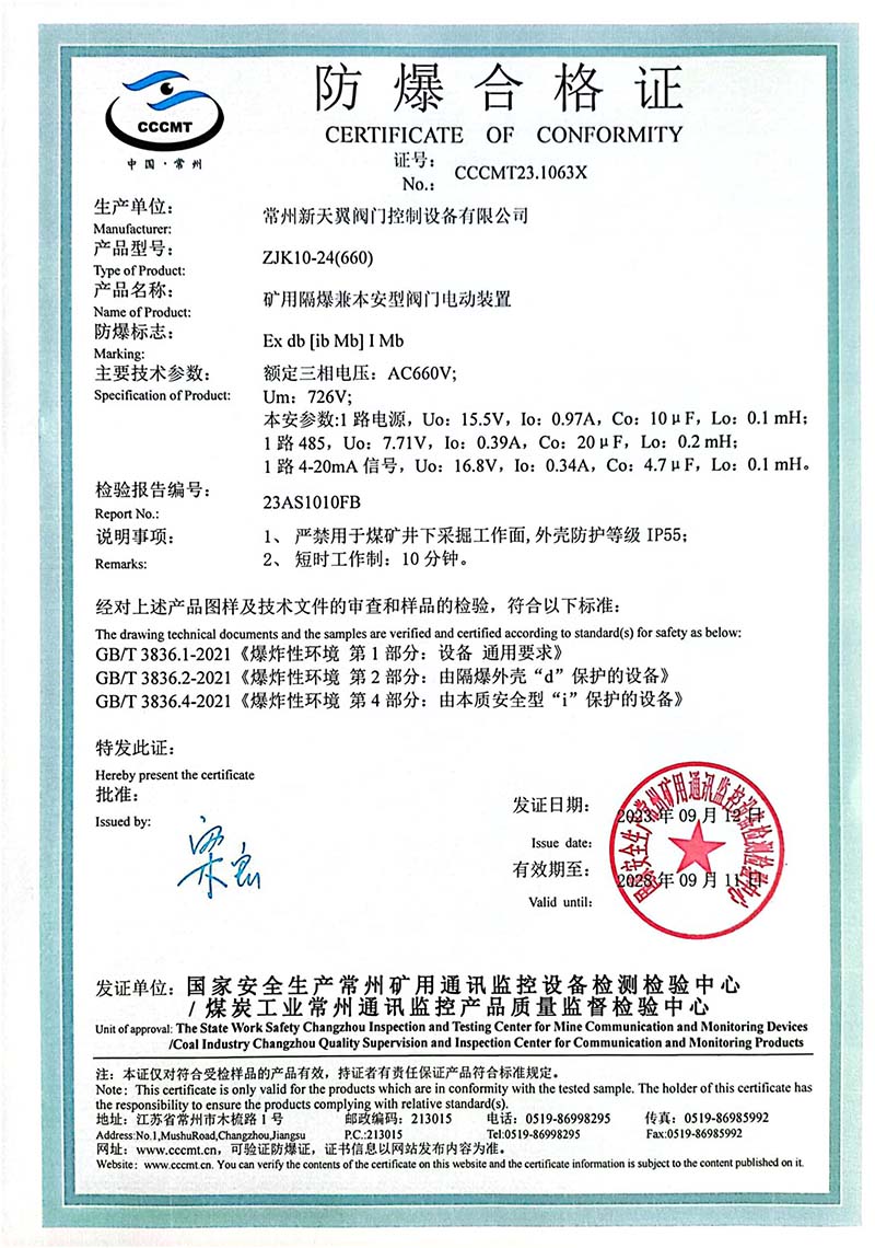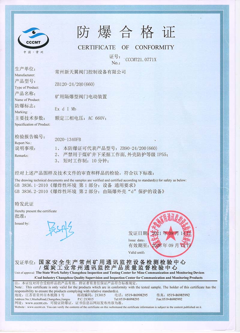 礦用隔爆ZB10-24中國國家強制性產品認證證書110.1